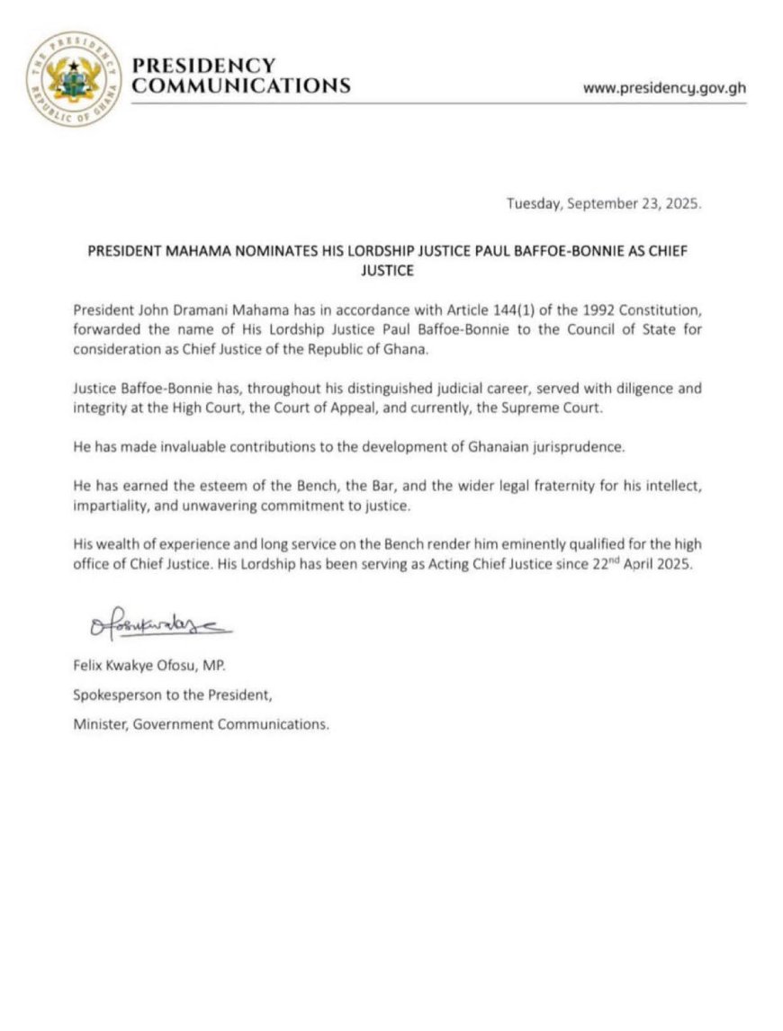 In accordance with Article 144(1) of the 1992 Constitution, the nomination has been forwarded to the Council of State for consideration. Justice Baffoe-Bonnie, who has served with distinction at the High Court, the Court of Appeal, and most recently the Supreme Court is widely regarded as one of the country’s most experienced and principled judges.