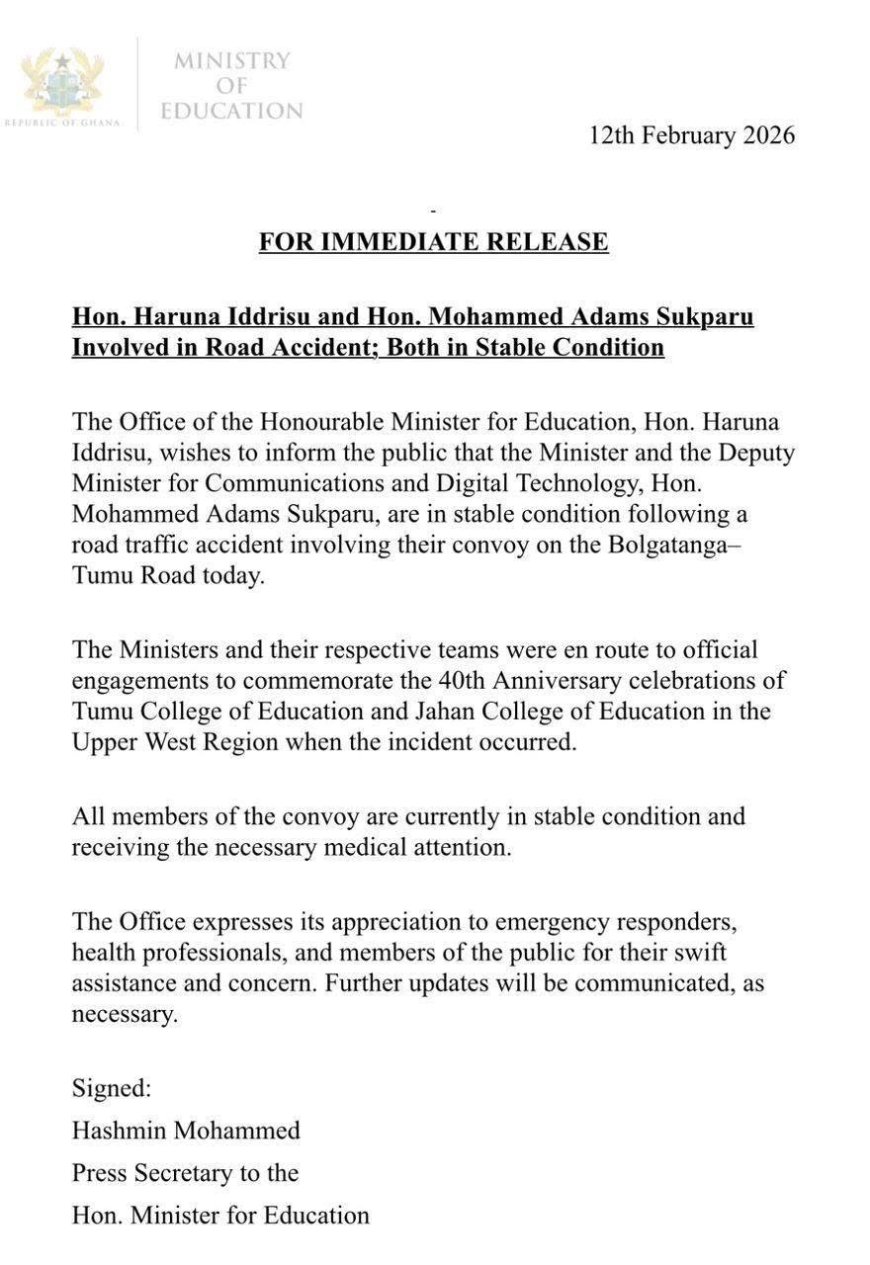 Accra, February 12, 2026 — The Minister for Education, Hon. Haruna Iddrisu, and the Deputy Minister for Communications and Digital Technology, Hon. Mohammed Adams Sukparu, are in stable condition following a road traffic accident involving their convoy.