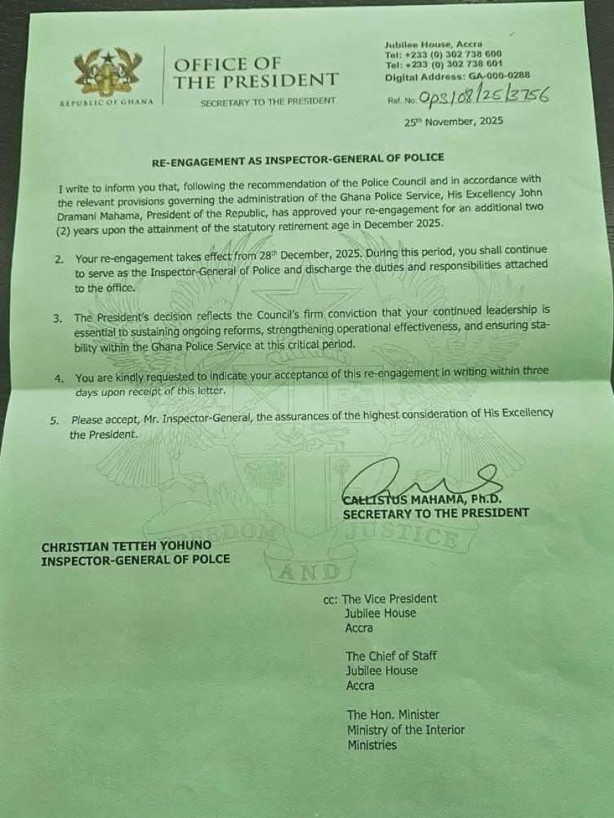 President John Dramani Mahama has approved the re-engagement of Inspector-General of Police (IGP) Christian Tetteh Yohuno for an additional two-year term beginning 28th December 2025, according to an official letter from the Office of the President.