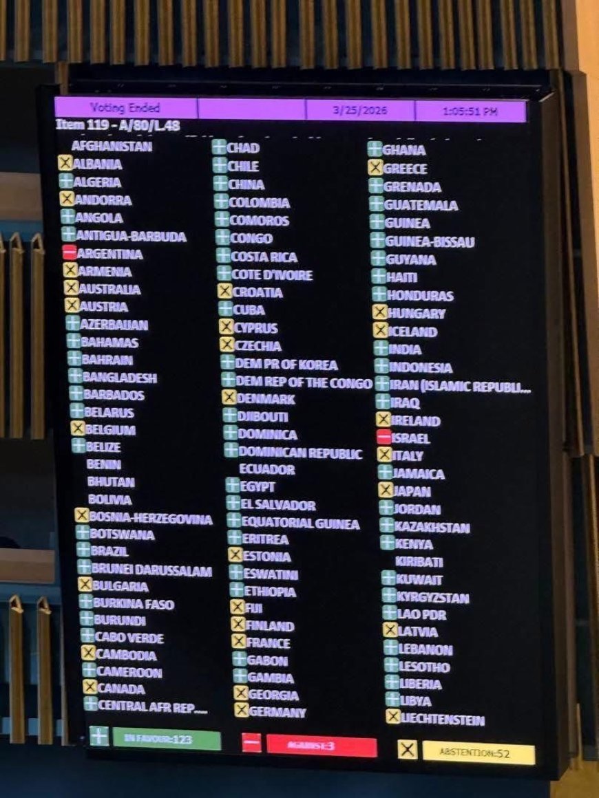The resolution, identified as A/80/L.48, calls for renewed global attention to the legacy and impact of the transatlantic slave trade, including discussions around reparations and historical justice.