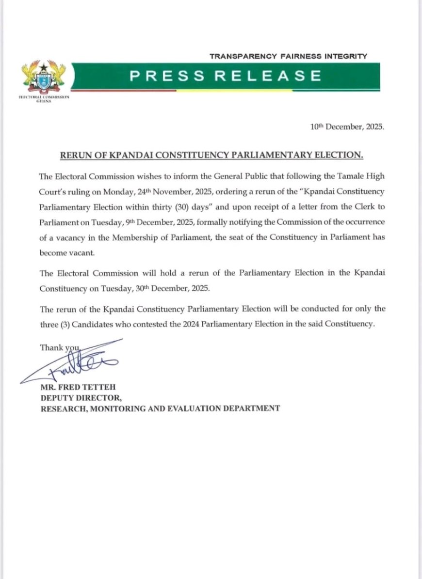 Accra, Ghana — The Electoral Commission of Ghana (EC) has announced that the rerun election for the New Patriotic Party (NPP)-held Parliament of Ghana seat for the Kpandai Constituency will be held on Tuesday, 30 December 2025. The rerun comes after a court annulled the 2024 election results following legal challenges over procedural irregularities.