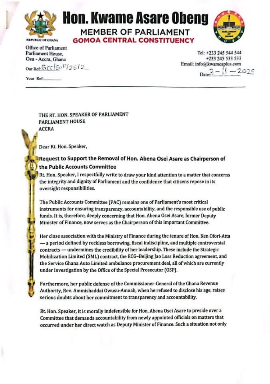Accra, November 3, 2025 — Hon. Kwame Asare Obeng, the Member of Parliament for Gomoa Central, has written to the Speaker of Parliament, Rt. Hon. Alban Bagbin, calling for the immediate removal of Hon. Abena Osei Asare as Chairperson of the Public Accounts Committee (PAC).