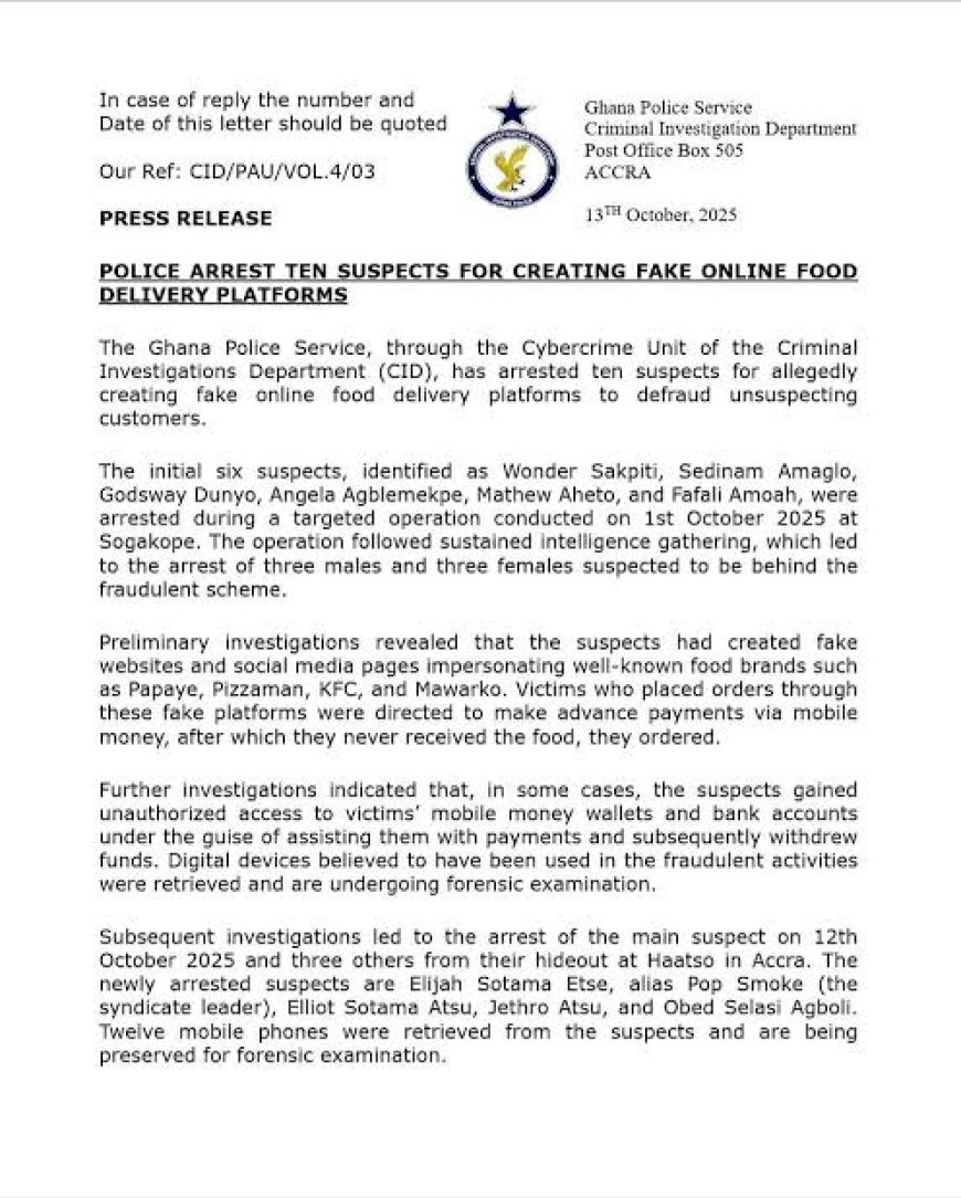 The Ghana Police Service has arrested ten suspects for allegedly operating fake online food delivery platforms used to defraud unsuspecting customers.