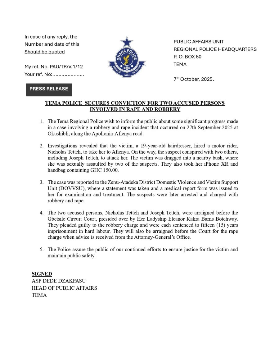 The Tema Regional Police Command reaffirmed its unwavering commitment to justice, condemning the heinous act and pledging continued support for survivors of sexual and violent crimes. Officials also cautioned women and girls — particularly those using commercial motorbike transport — to remain vigilant and immediately report suspicious behaviour.