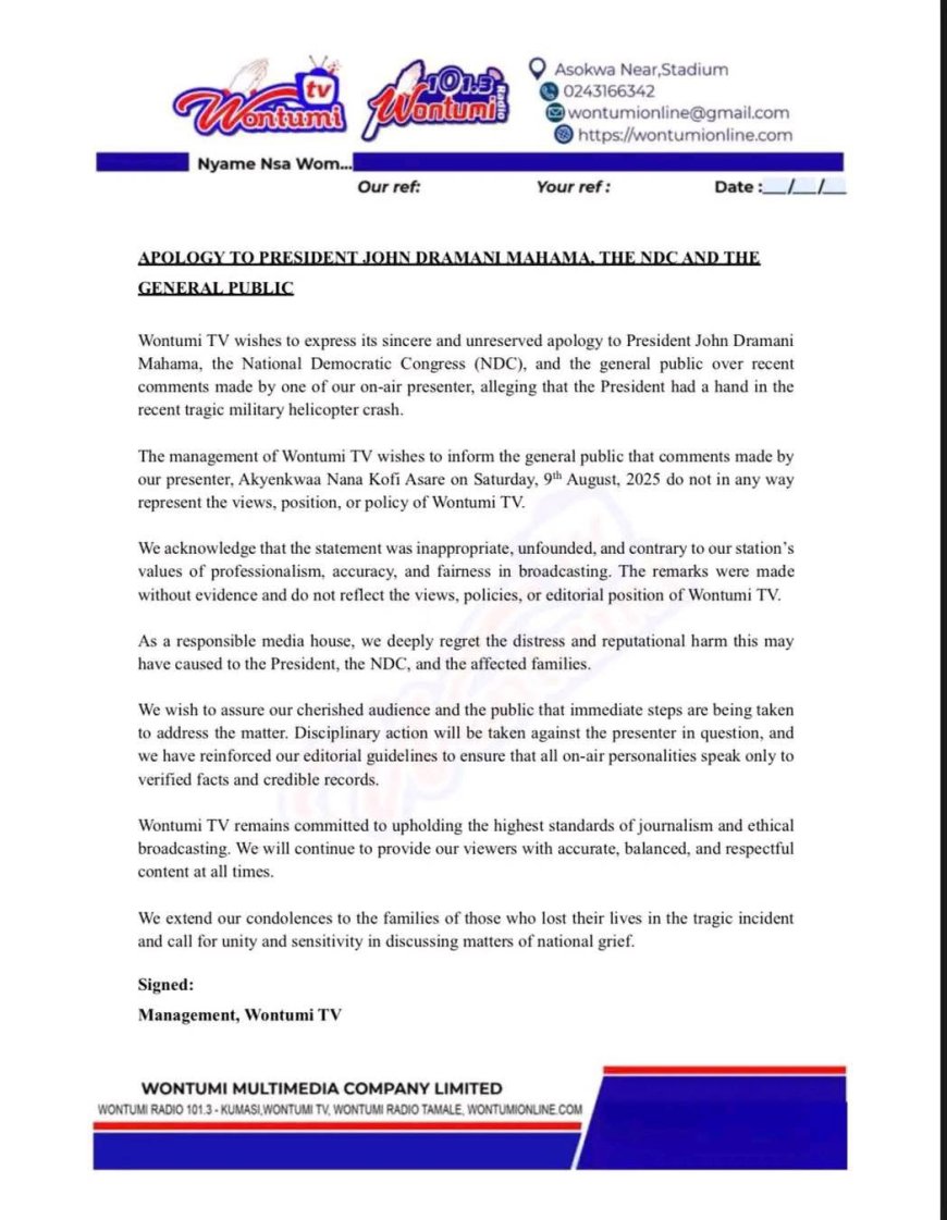 Wontumi TV has issued a public apology to the general public over comments made by one of its presenters, which alleged presidential involvement in the recent tragic military helicopter crash.